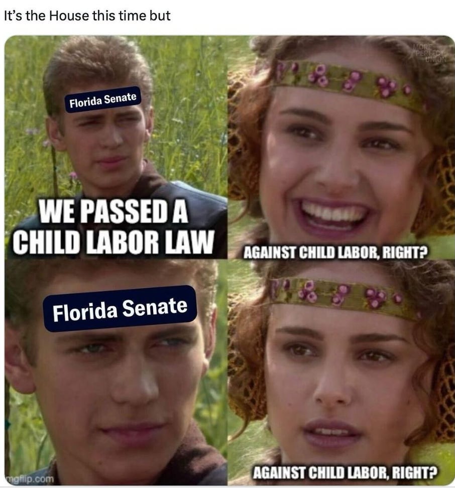 Amongst the numerous activities available for children to participate in here in the beautiful state of Florida, Republicans in their infinite wisdom have decided that working in construction, one of the most dangerous industries, is one of them. Who needs school, extracurricular activities, and hanging out with friends when you can build roofs and play with scaffolding?